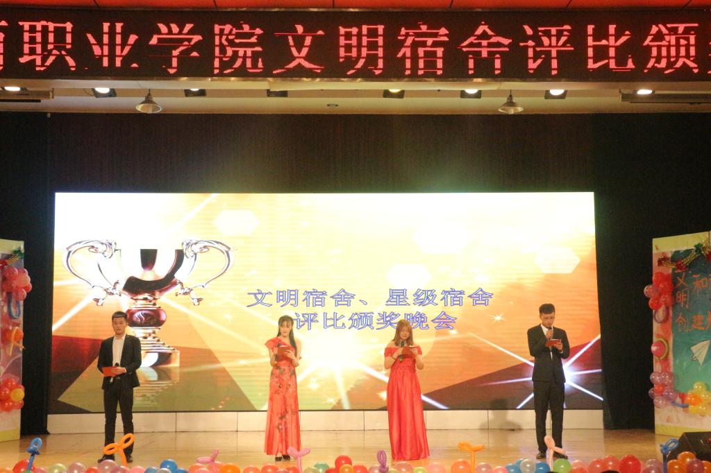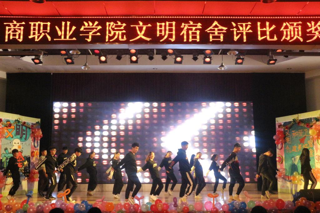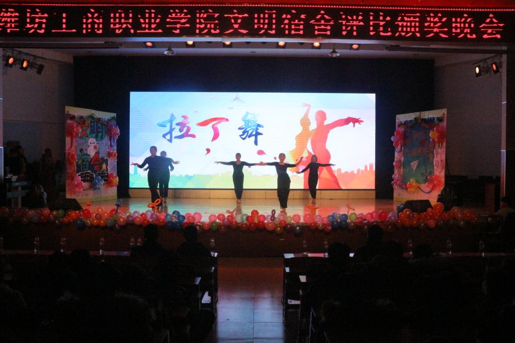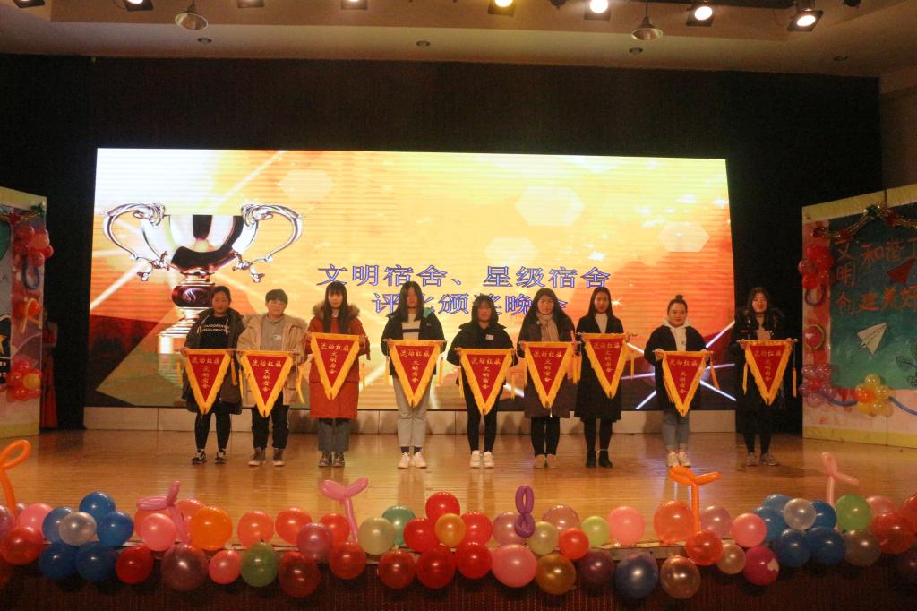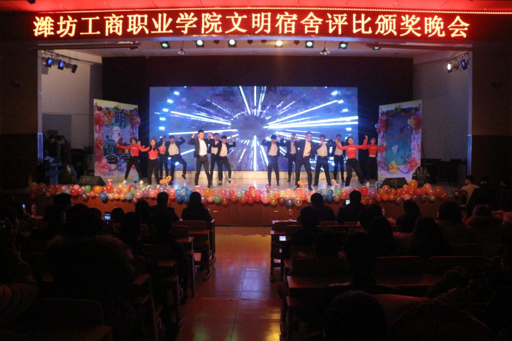12月21日晚,在第一报告厅隆重举办以创新宿舍文化,放飞青春梦想,展现多彩校园,构建温馨之家为主题的潍坊工商职业学院文明宿舍评选颁奖晚会。团委王卫书记和学生处董明冉副处长、各院系负责人以及学生代表900余人观看晚会。