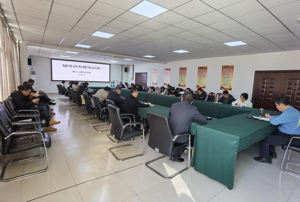 为了进一步提高辅导员的工作水平和能力,更好地服务学生成长成才,12月3日上午,潍坊工商职业学院在图书信息楼321会议室召开辅导员培训会议。参加会议的有党委副书记、副校长刘国庆,学生处班子成员、各二级学院党团书记及全体专职辅导员。