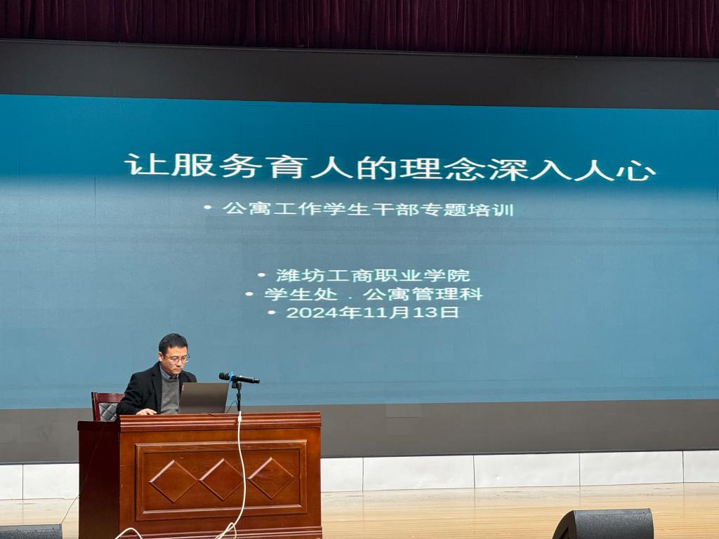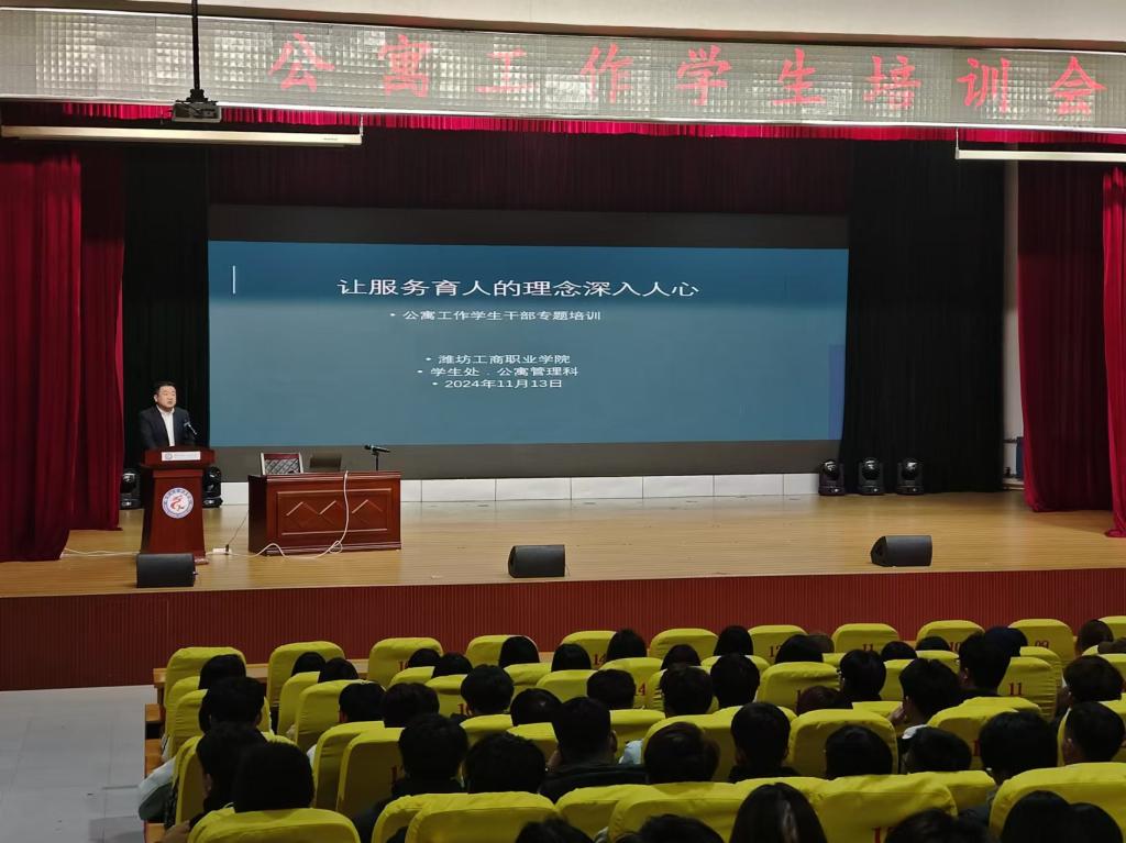 为了进一步提升学生宿舍管理水平,深化服务理念,11月13日潍坊工商职业学院于图书信息楼第一报告厅召开公寓工作学生干部专题培训会,此次会议旨在通过系统学习和实践,让服务理念深入人心,更好地服务于广大同学。学生处副处长董明冉老师、王振太老师及全体公寓工作学生干部出席本次会议。