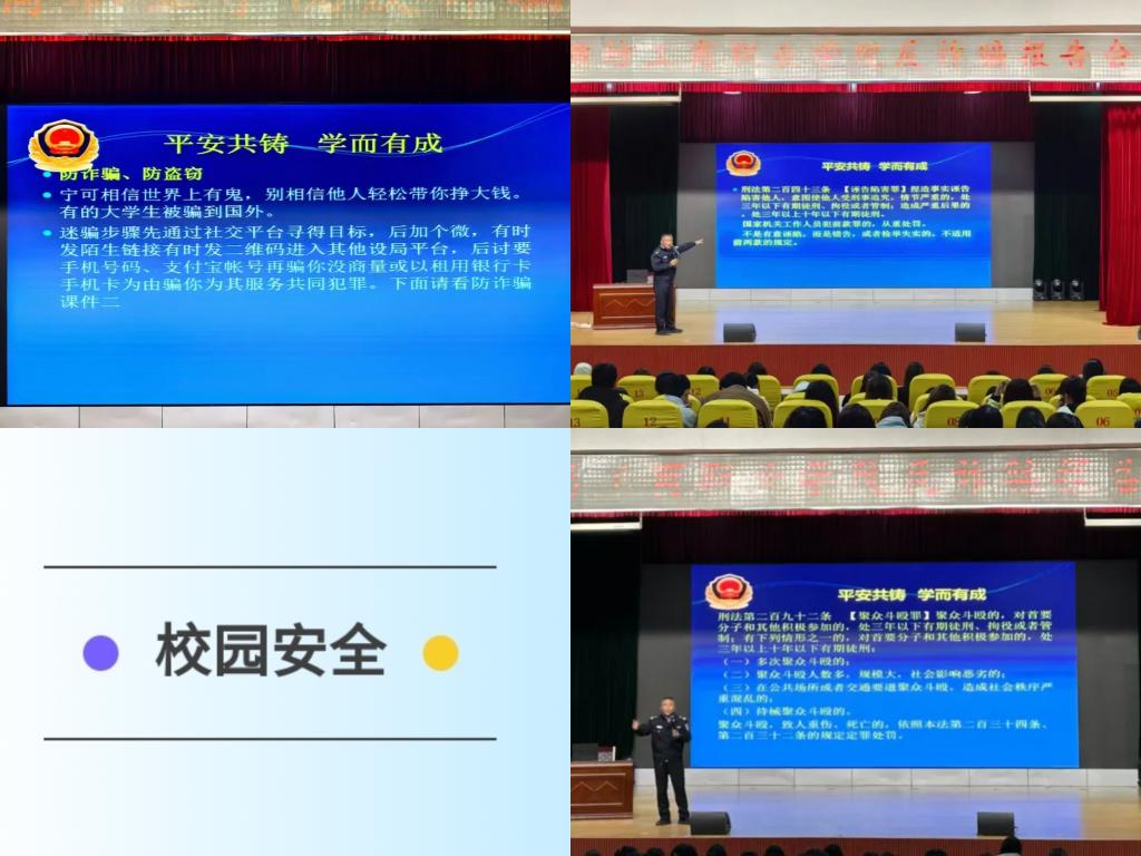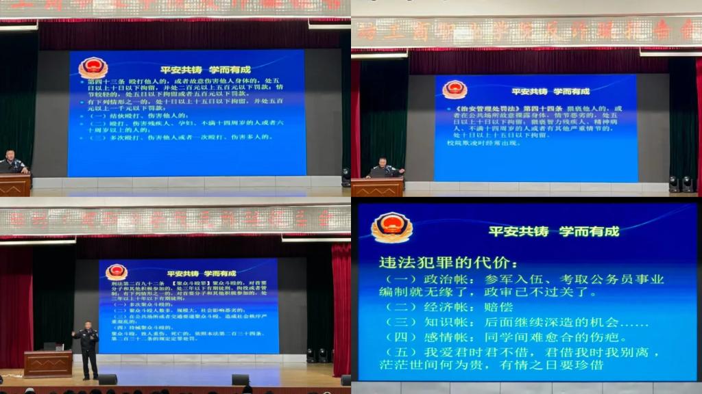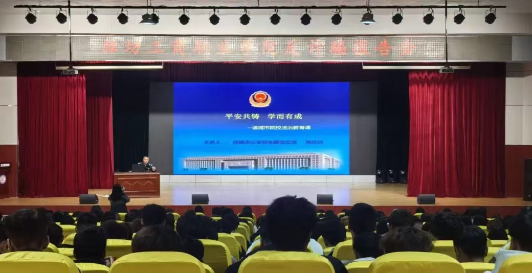为提升全体师生法治意识和自我保护能力,加强校园法治教育宣传力度,营造文明、平安、和谐的校园育人环境,10月28日,我校在第一报告厅成功举办“平安共铸,学而有成”法治教育报告会,有幸邀请到诸城市密州街道朱解派出所杨传昌副所长作报告。