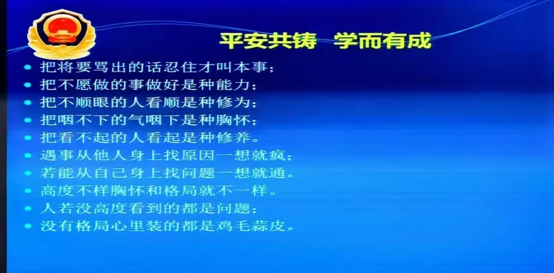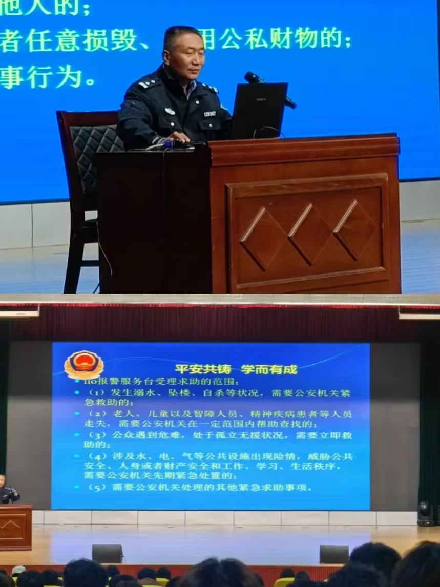 会议上,杨所长先为同学们讲解了110报警受理范围及注意事项,通过一个个真事的案列讲解,提高了同学们自我保护意识和能力,使同学们在遇到紧急情况时能够迅速、准确地报警。