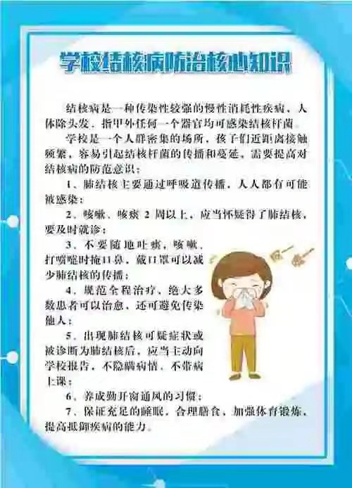 肺结核并不可怕,只要同学们积极地配合做到早预防、早治疗就可以有效地防止肺结核,让我们共同努力为健康的身体筑起坚固的传染病防御城墙,共同维护一个健康、安全的学习和生活环境。