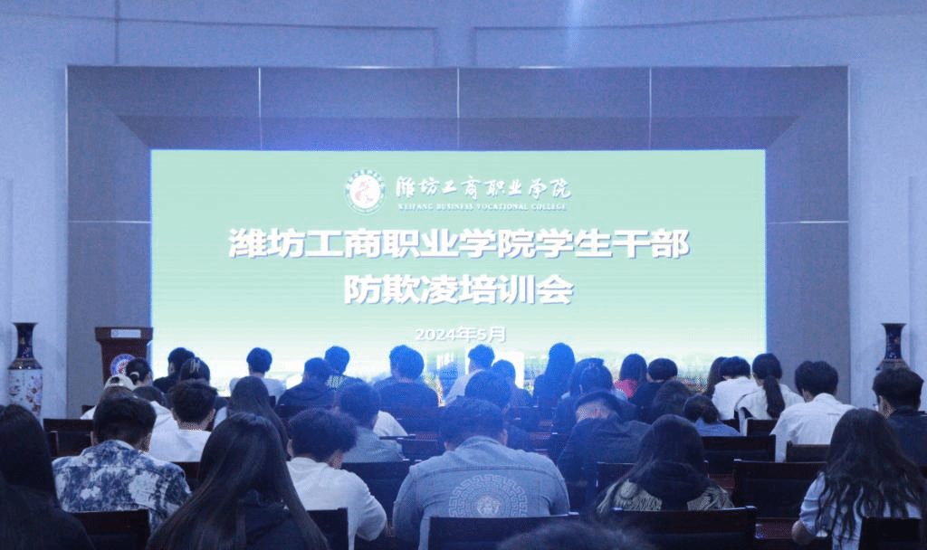 为更好地预防和打击校园欺凌行为,加强防欺凌教育工作,5月19日晚潍坊工商职业学院在第二报告厅召开学生干部防欺凌培训会,以此提升学生的自我保护意识,营造一个安全、和谐的校园环境。学生处处长、团委书记柴元昌,部分学生干部代表参加本次培训活动。