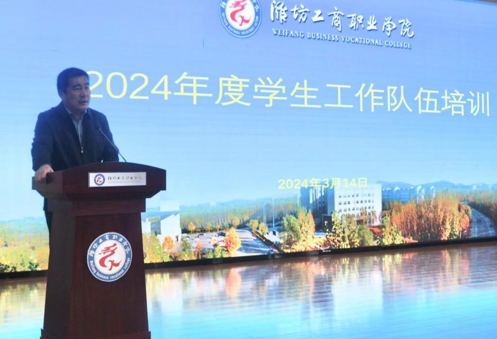 3月14日下午,我校在第二报告厅召开2024年度学生工作队伍培训会。潍坊工商职业学院党委葛国文书记、党委副书记、副校长刘国庆、学校学生处团委等职能部门相关领导、各二级学院党团书记、专兼职辅导员参加本次会议,会议由学生处副处长董明冉主持。