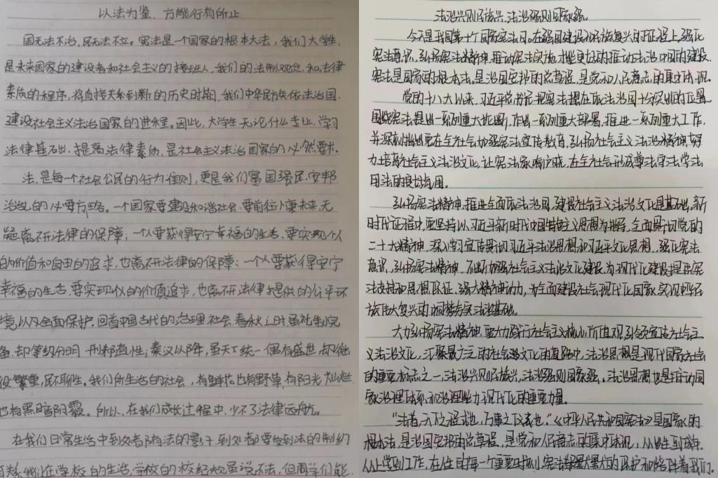 征文活动。我校各院系举办宪法征文比赛,描述宪法故事,阐释宪法精神,推动青年一代宪法学习宣传教育走深走实,培养大学生在法治中国建设进程中的责任与担当。