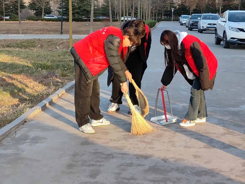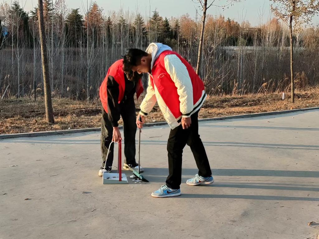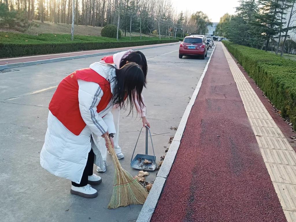 志愿者们身穿着红色马甲,拿着卫生工具,分工明确,紧密合作,有条不紊地认真清扫落叶,清理垃圾,对于草丛夹缝中等不便清理的位置认真清扫,彻底打扫每一个卫生死角,忙碌的身影成为校园一道靓丽的风景线。