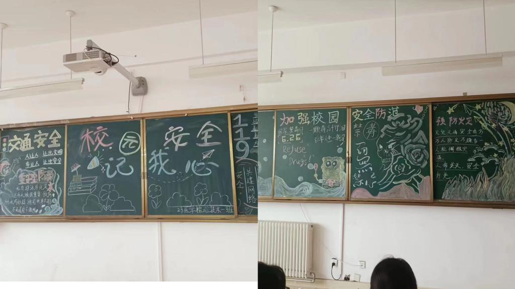 设计安全教育主题黑板报。学院各班充分发挥学生的自主创新能力,围绕不同的“安全教育”主题,以防火、防骗、防溺水、校园安全知识等为重点进行安全宣传教育,向师生展示了一幅幅图文并茂、内容丰富的板报作品。