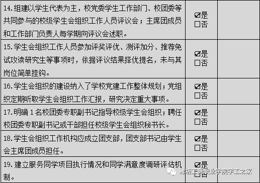 二、潍坊工商职业学院学生会评议制度是学生会工作的重要组成部分,是加强学生会思想建设、队伍建设,严格学生会工作纪律、规范学生会工作人员管理的重要措施。学生会评议采用学习教育、自我评价和组织评议相结合的方式,对学生会工作人员的表现和作用发挥情况进行综合评价,并通过评优和处理等方式,达到学生会评议的工作目的。