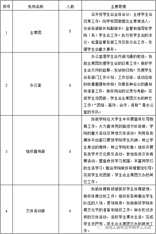1、潍坊工商职业学院学生代表大会学生会主席团由代表大会选举,经考试、面试环节,经学生处团委研究并报请学院党委批准后产生。