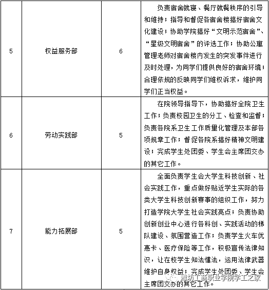 第十九条 根据实际需要,确定学生会组织结构。学生会现设主席团、办公室、能力拓展部、组织宣传部、文体活动部、劳动实践部和权益服务部。各部设部长一名,副部长一到两名,干事视具体情况而定。