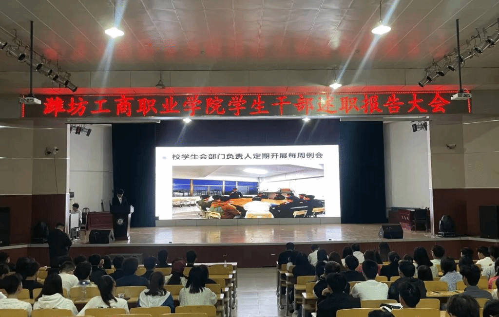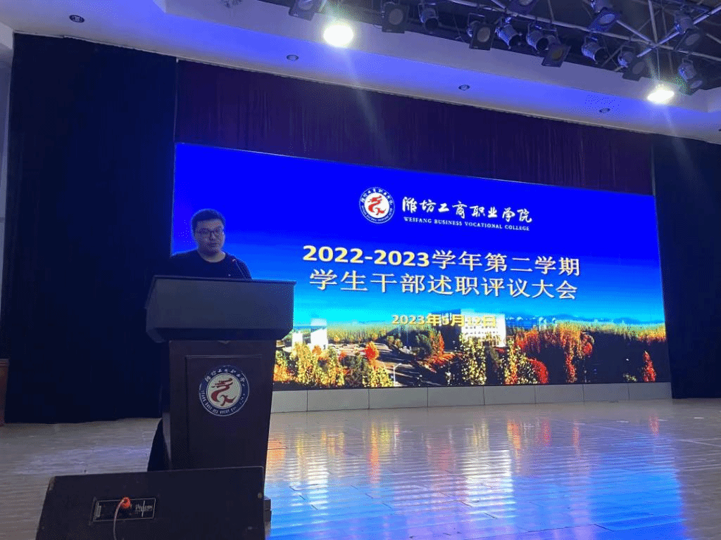 为进一步加强学生干部队伍建设和经验交流,潍坊工商职业学院于5月12日下午在第一报告厅召开2022-2023学年第二学期学生干部述职评议大会。参加会议的有学生处处长柴元昌、副处长董明冉、副处长辛玉刚,黄小娇老师、校学生会全体成员、部分学生代表。