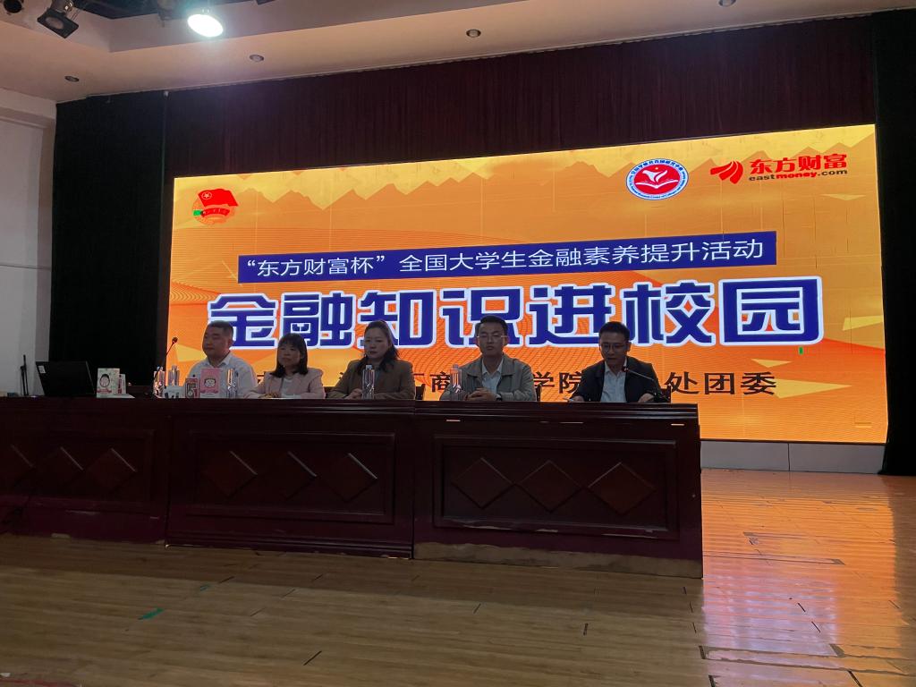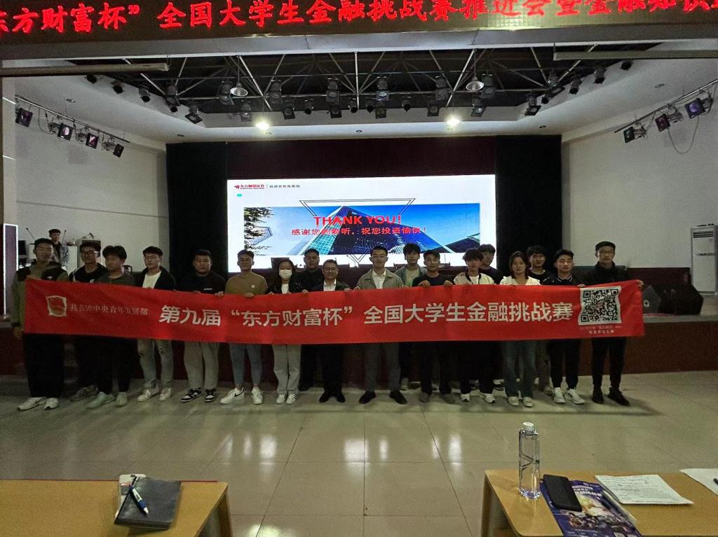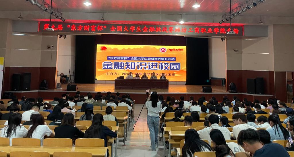 为深入学习宣传贯彻习近平新时代中国特色社会主义思想和党的二十大精神,帮助大学生掌握金融知识,培养投资实践能力,提高金融专业水平,完善就业创业素质,按照“东方财富杯”全国大学生金融素养提升活动安排,我校于5月9日下午在第一报告厅成功举办第九届“东方财富杯”全国大学生金融挑战赛推进会暨金融知识进校园活动。参加本次活动的领导主要有东方财富信息股份有限公司山东高校区总监杨生鹏、潍坊区主管冯渡超、资深讲师曲艺、高级主管商婧贻,学校团委书记朱耀秀老师、学校学生会主要学生干部、各二级学院学生会部长及以上主要学生干部、各班班长及团支书共400多人参加,活动由学生处副处长董明冉老师主持。