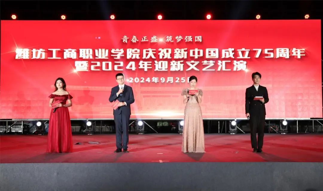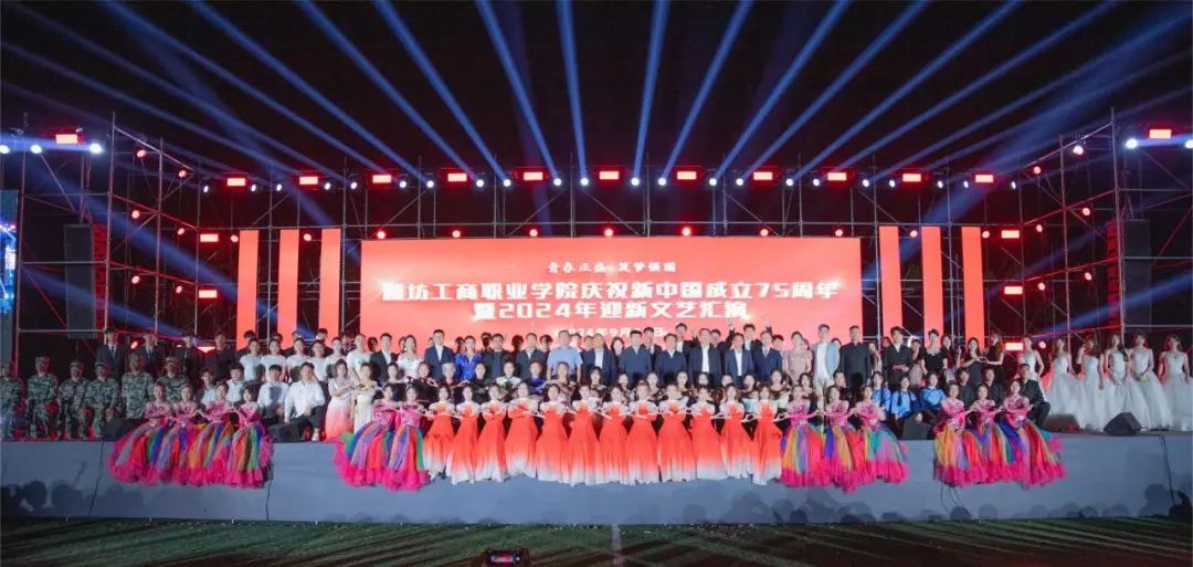 9 月 25 日晚,“青春正盛,筑梦强国”潍坊工商职业学院庆祝新中国成立75周年暨2024年迎新晚会在我校体育场举行。学校校长张绍秋,党委书记葛国文,执行校长、党委常务副书记郑志松,校党委副书记、副校长刘国庆等校领导,全体教职工,部分企业代表以及全体在校生共计 2 万余人齐聚一堂,共赏迎新晚会,同庆祖国华诞。