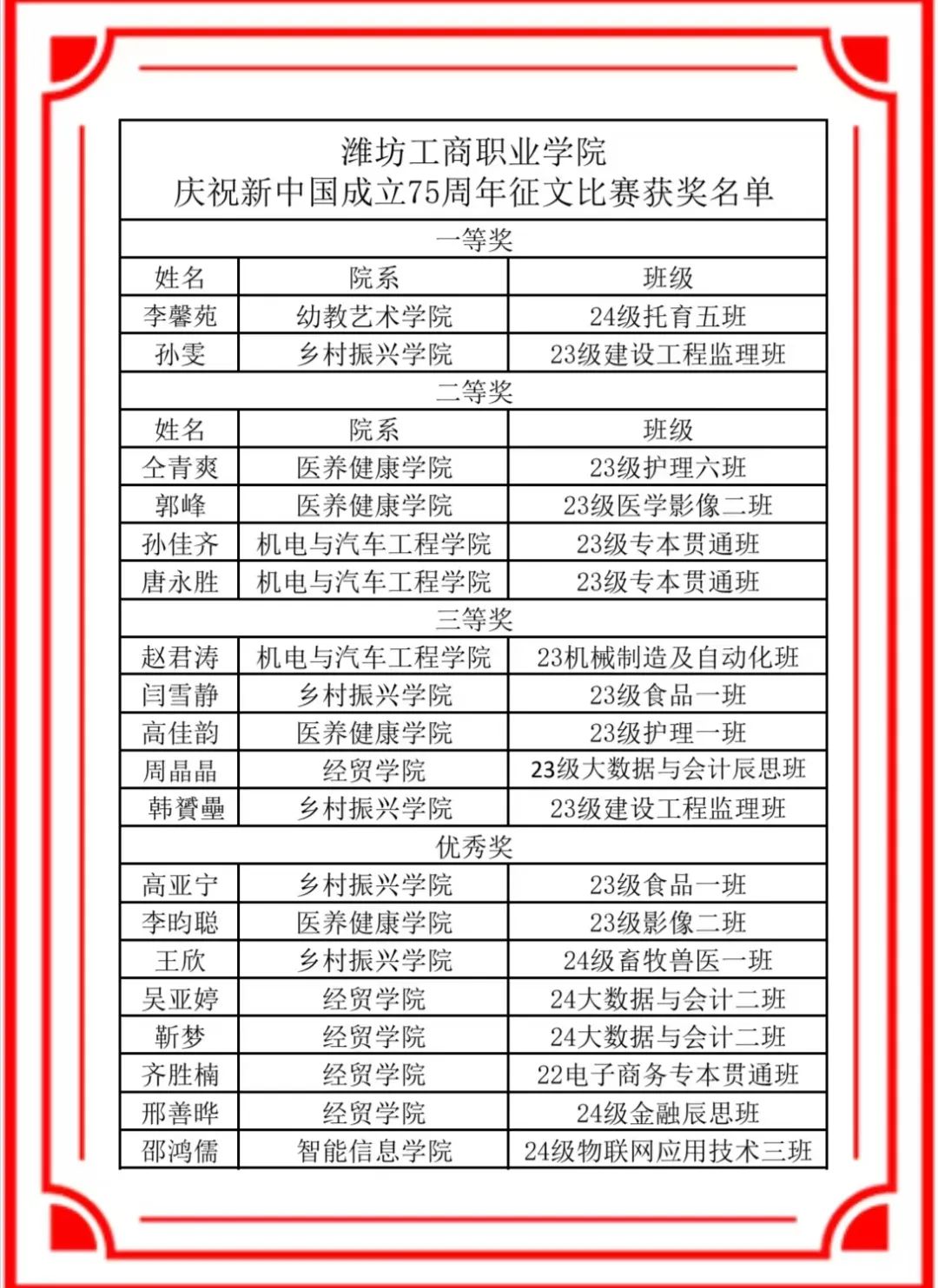 盛世华章,荣耀中华。值此中华人民共和国成立 75 周年之际,潍坊工商职业学院举办了一场极具意义的 “祖国成就我来讲” 征文比赛。全校师生踊跃参与,纷纷以文字诉说对祖国的热爱与赞美之情。