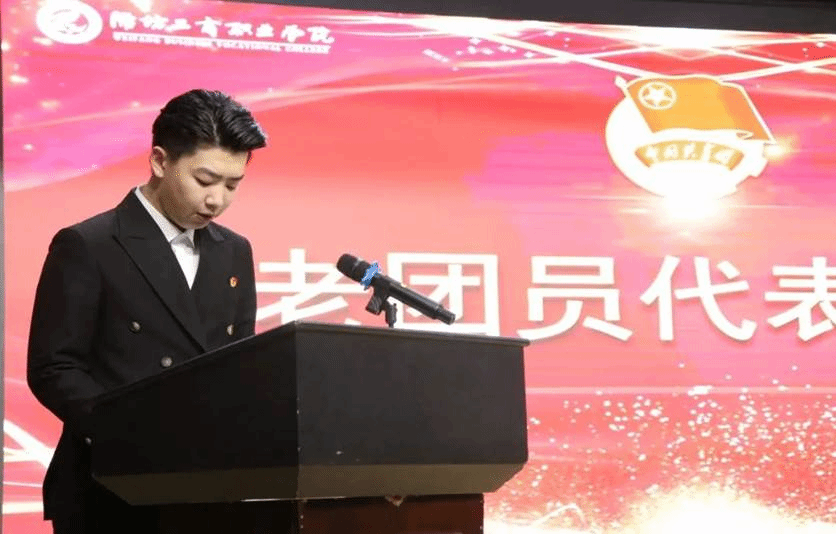 老团员代表傅常泰同学代表所有老团员们向新一批入团的同学表示热烈的祝贺和诚挚的欢迎。并告诫新团员同学们,入团不只是形式,团徽也不只是标志,而团员身份更应该成为自己在学习和工作中的动力,要努力学习,不断进取,坚守自己的入团誓言。