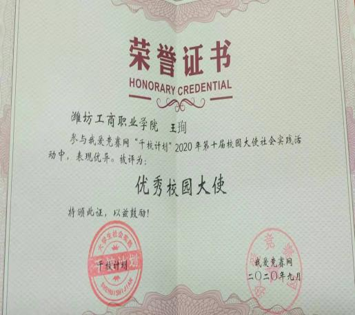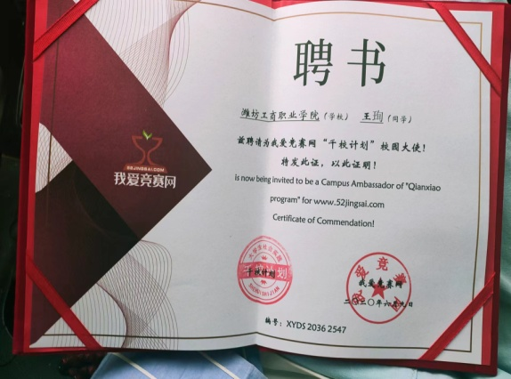同学们在校内外积极参加社团活动拓展眼界,不知不觉中也带动了我向积极进取的同学看齐,学以致用的把在学校学到的用在我为数不多的几次社会实践中,力求磨练自己的心性与基本的职业素养。2019年参与我爱竞赛网“千校计划”,在三个月实习期合格后,被评为“优秀校园大使”,负责线上赛事宣传,包括线上宣传各级政府、社团等举办的比赛;社群运营,包括社群拉新、留存、活跃等。