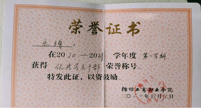 自2019年来到潍坊工商职业学院,在老师和同学们的鼓励下,我一直在努力使自己过的充实,谋求自身的多方面发展。