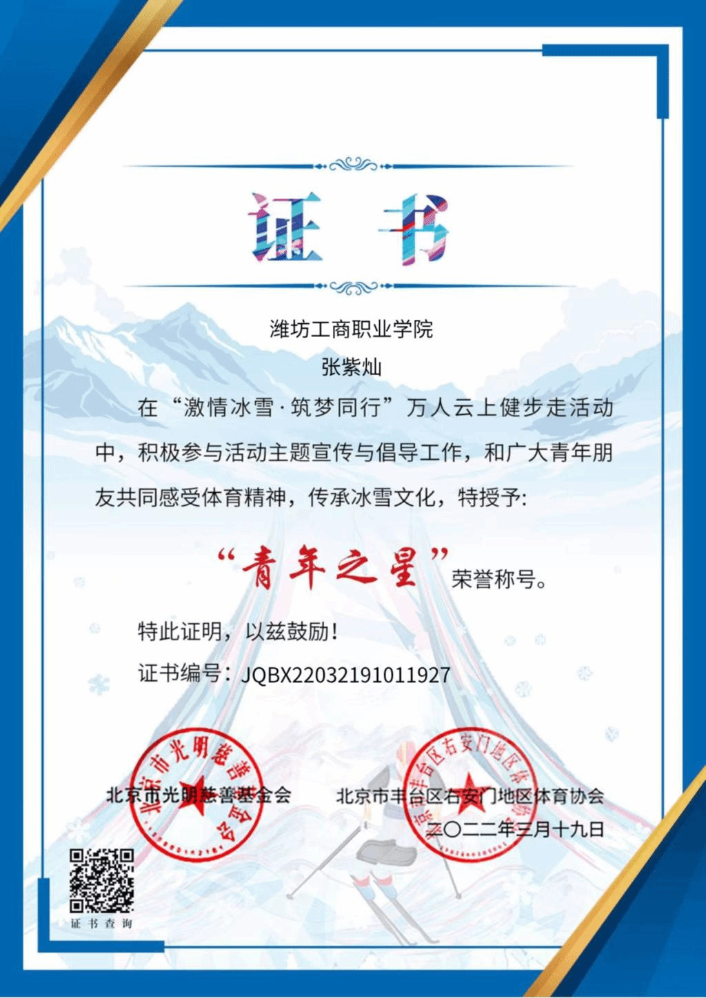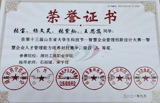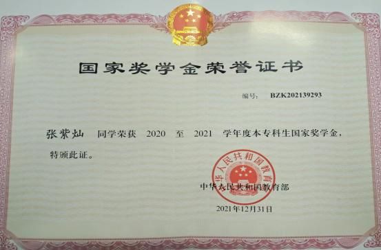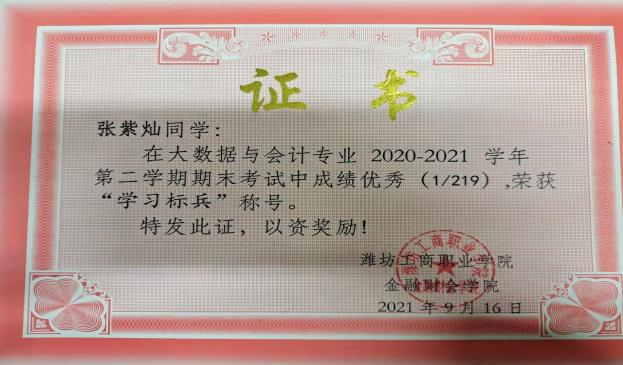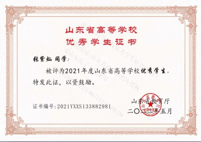 2020-2021学年我以全专业第一以及综合素质测评第一的成绩,非常荣幸地获得了国家奖学金。在大学期间,我多次获得学院“优秀学生”“优秀团员”等荣誉称号,也十分荣幸地被评为了山东省高等学校优秀学生。虚心使人进步,骄傲使人落后,在今后的学习生活中我要不断突破自我,更上一层楼。以梦为马,我们未来可期;不负韶华,我们的征途是星辰大海。