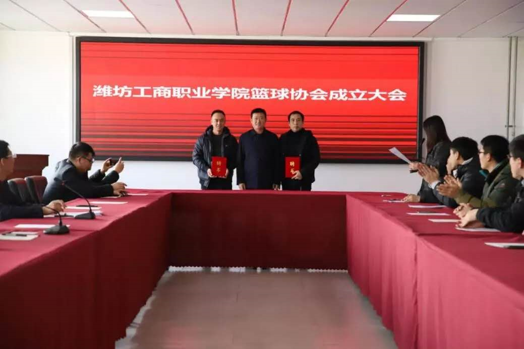 会上,学院工会陶炳勇主席宣读“关于成立潍坊工商职业学院篮球协会的批复”潍工职院工发【2019】4号文,并宣布篮球协会正式成立;公共基础部王桂珍主任宣读了潍坊工商职业学院篮球协会理事会成员名单;周平副院长首先代表学院对协会成立表示了热烈的祝贺,并发表了热情洋溢的讲话,希望协会能够提高政治站位,服务学院中心发展大局,通过协会工作,使广大师生养成强身健体的良好习惯,以更加积极、健康的心态和良好的精神面貌投入工作与学习中去。篮球协会的副会长王绪义老师宣读了篮球协会章程,全体篮球协会会员以举行表决的方式通过了会议章程;篮协王术磊会长作了表态发言和宣读了2020年篮球协会工作计划大会;最后学院党委郑志松书记向两位的校外指导教师颁发聘任证书,并合影留念。