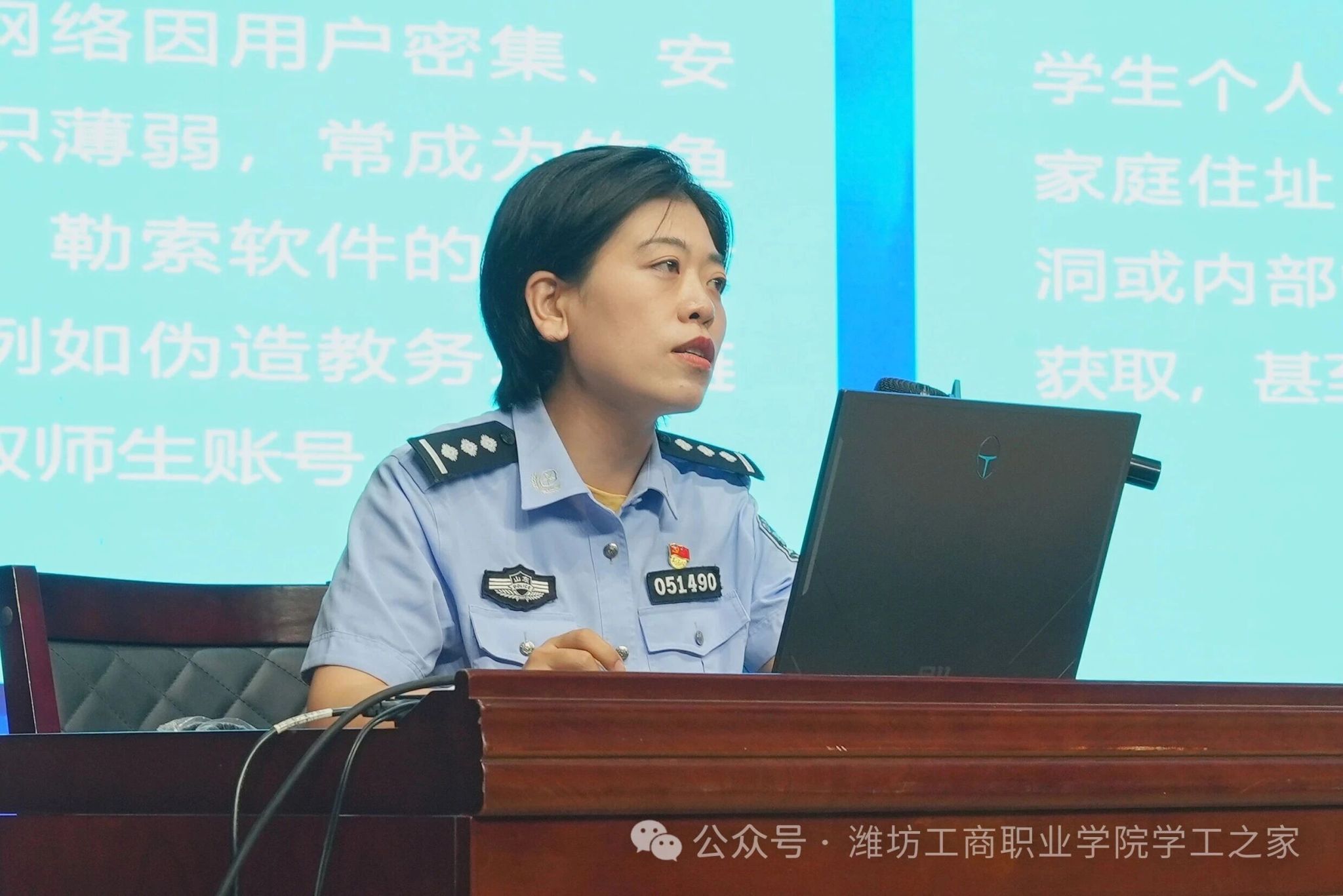 为进一步提升广大师生的网络安全意识和防护技能,营造安全、健康、文明的校园网络环境,9月17日下午诸城市公安局网络安全保卫大队联合密州派出所走进潍坊工商职业学院,为同学们带来了一场网络安全宣讲活动,各二级学院学生代表共同参加会议。