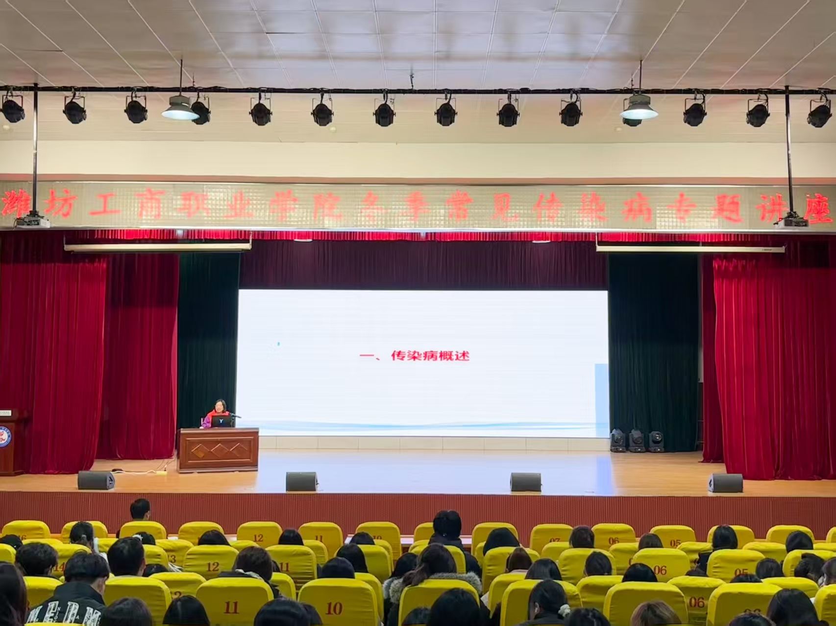 为切实做好冬季校园传染病防控工作,保障广大师生的身体健康与安全,筑牢校园安全防线,潍坊工商职业学院12月12日于第一报告厅举办冬季常见传染病专题讲座。活动特邀诸城市密州卫生院管清华主任担任主讲人,由学生处副处长董明冉老师主持,各二级学院学生代表共同参加。