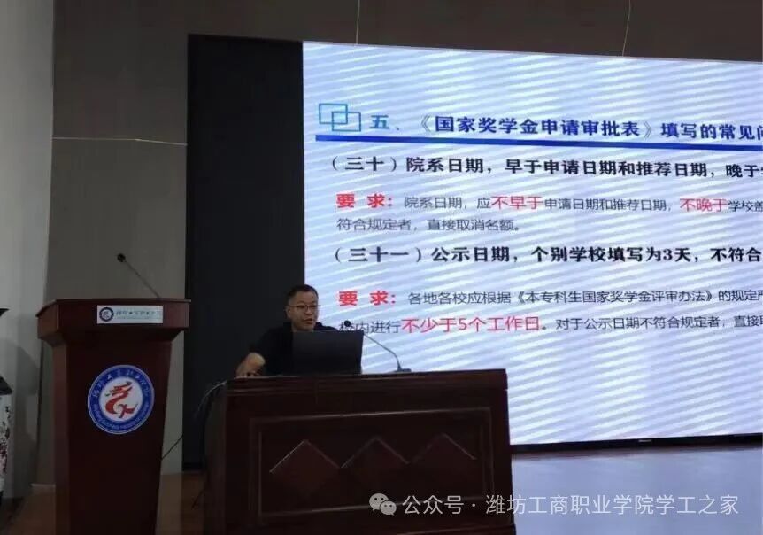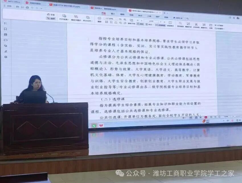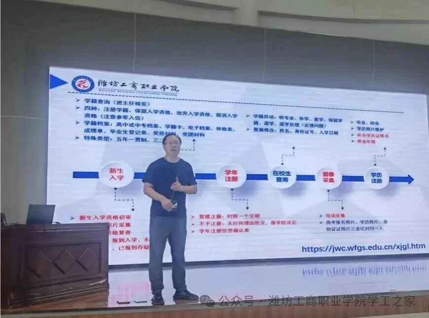 教务处宋宇佳就学分制管理相关制度进行深度解读。她详细介绍了《潍坊工商职业学院学分制管理办法》的核心内容,包括选修课的选修原则、选报程序,课程学分的计算规则,以及补考与重修的评定标准和具体操作要求 。其讲解旨在帮助辅导员明晰学业管理细则,进而引领学生学习积极性,为学风建设提供制度支撑。